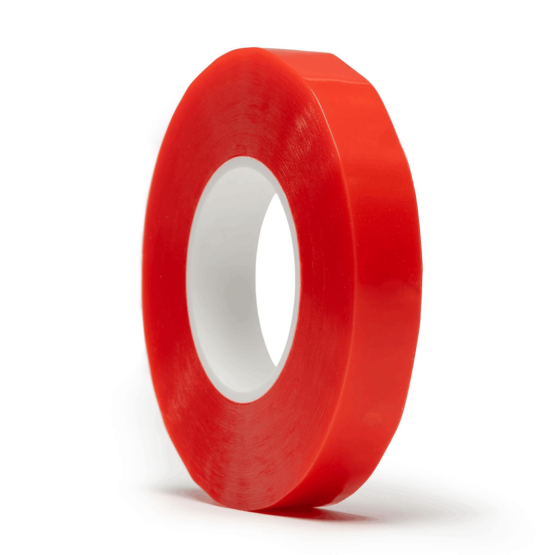 230 µm Polyesterfolie, beidseitig mit hochwertigem, aggressivem Acrylklebstoff beschichtet und durch eine rote PP-Trennfolie geschützt.